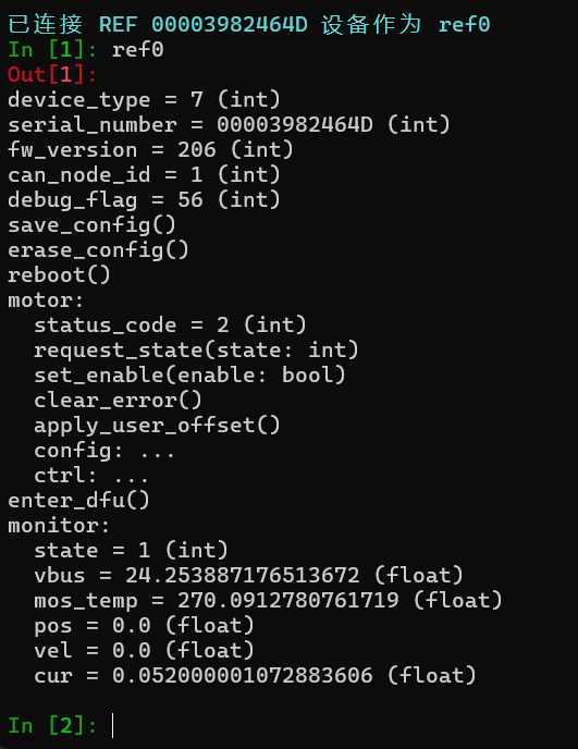 在上位机中直接键入 ref0 并敲击回车,会显示当前L28的基本信息。根据下图所示,当前L28的固件版本为 206,CAN总线ID为1。
